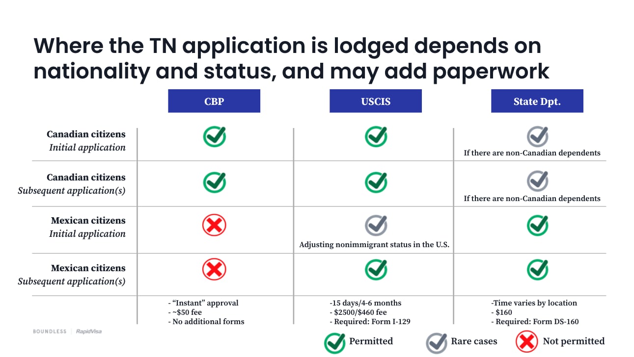 - This depends on the employee’s nationality, whether it is their initial or subsequent TN application(s), and cost/time considerations for all parties